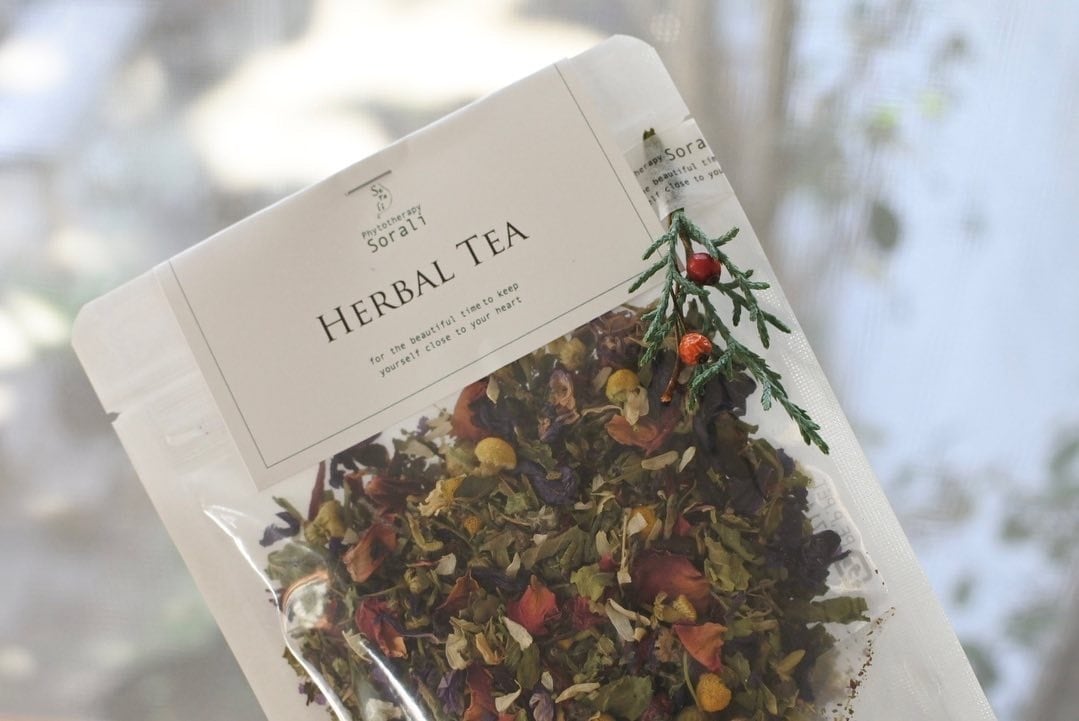 原材料: ホーリーバジルハイビスカス、ジャーマンカモミール、ベルベーヌ、ブルーマロウ、ローズ、セントジョーンズワート
